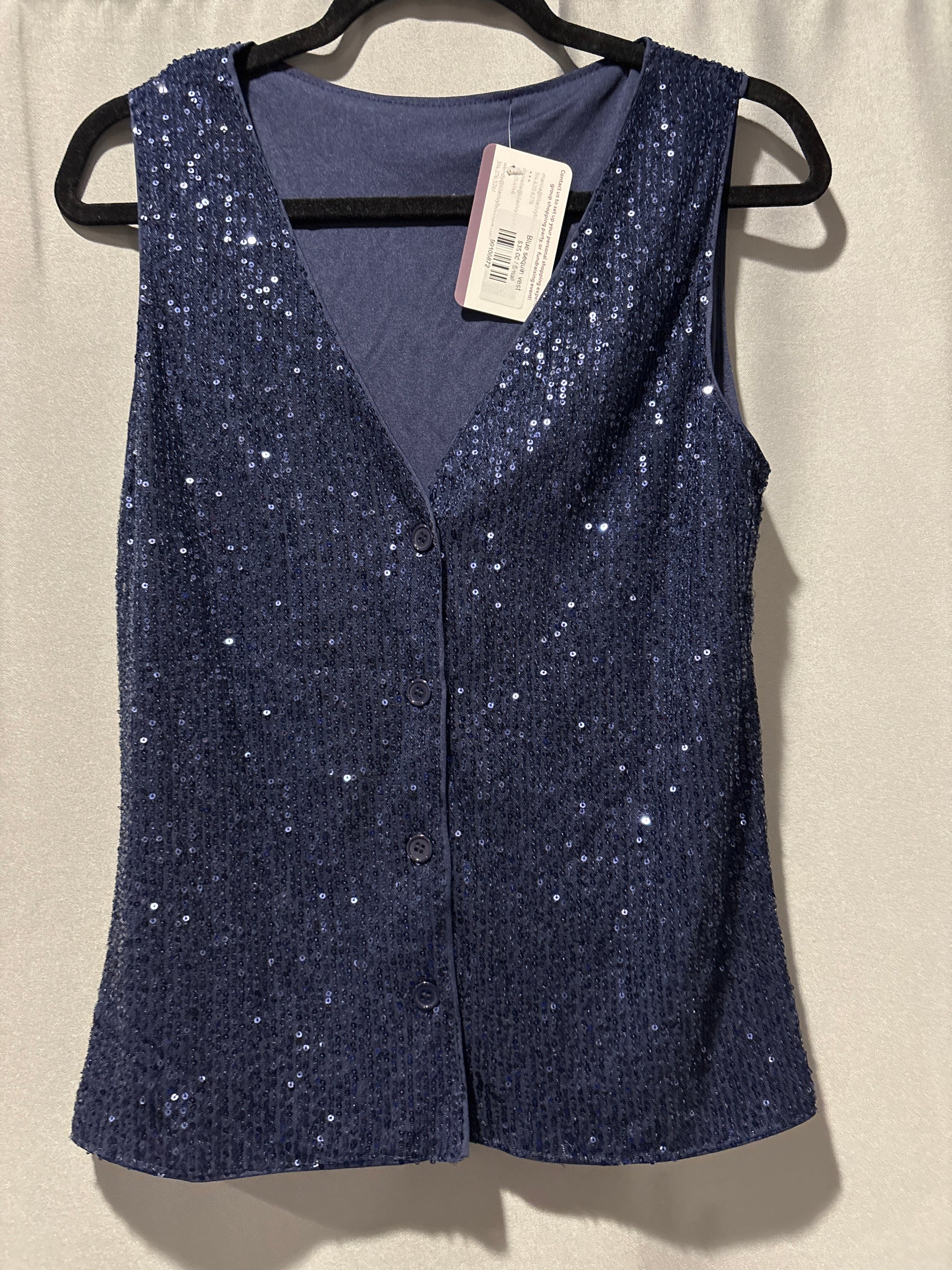 Exceptionally pretty, this blue sequin vest can be worn year-round. Great addition to anyone’s wardrobe.