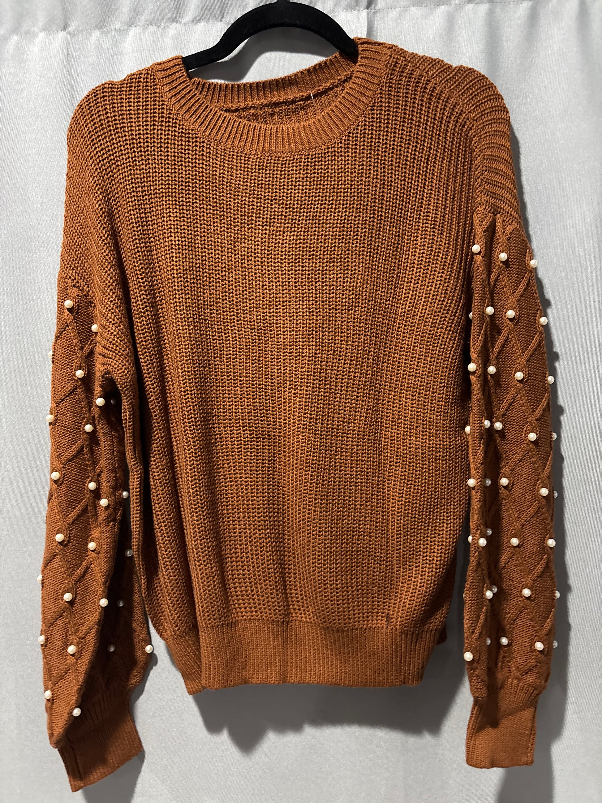 Knit sweater with pearl, embellished sleeves, beautiful chestnut color