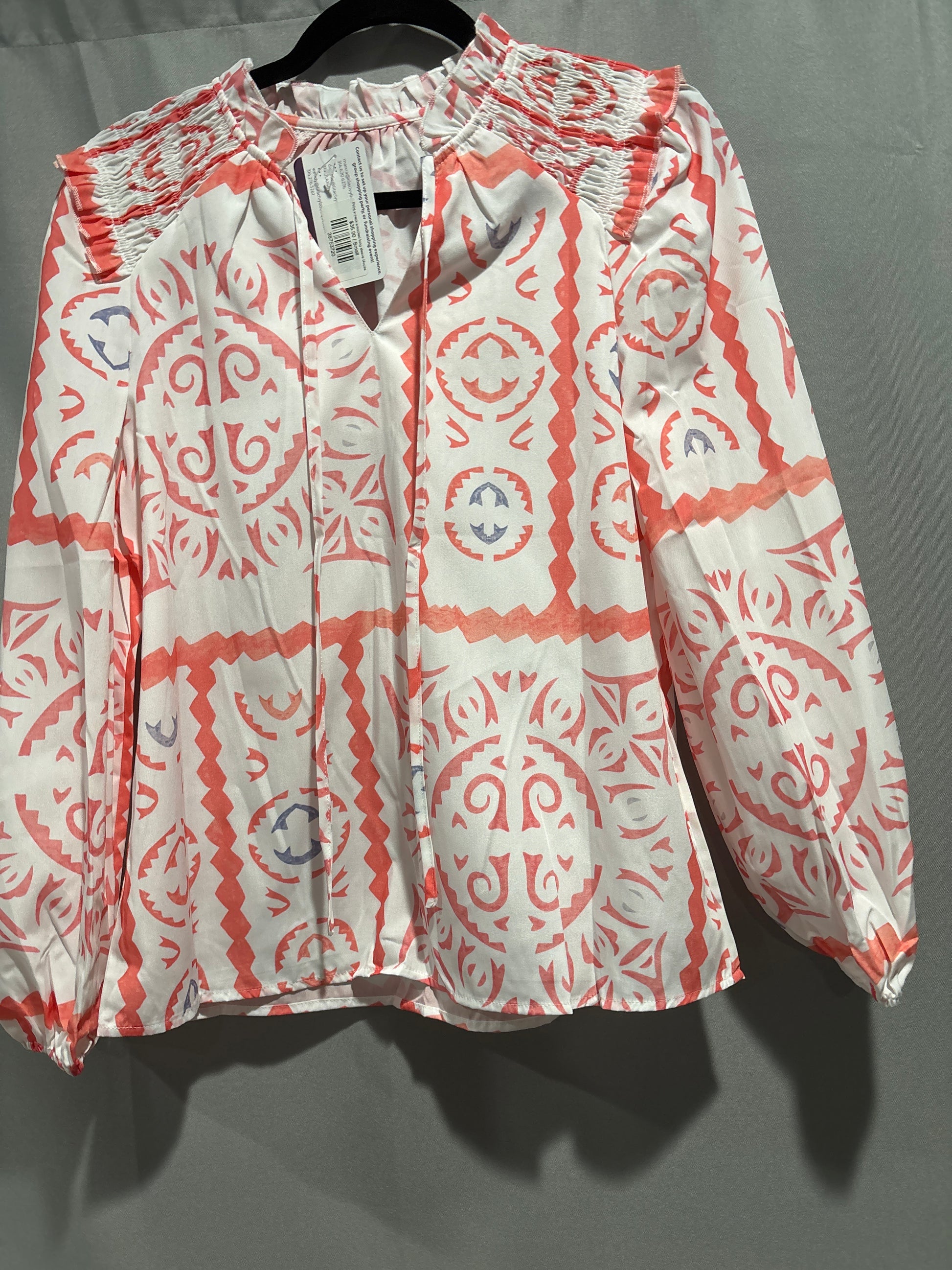 Print V-neck smocked v-neck, long sleeve blouse. Embrace the essence of the desert with our blouse, featuring a Boho abstract design. Stand out in style with the frill detailing that has a touch of femininity to the chic blouse. The sheared details on the sleeves create a trendy gathered look that elevates the overall design.