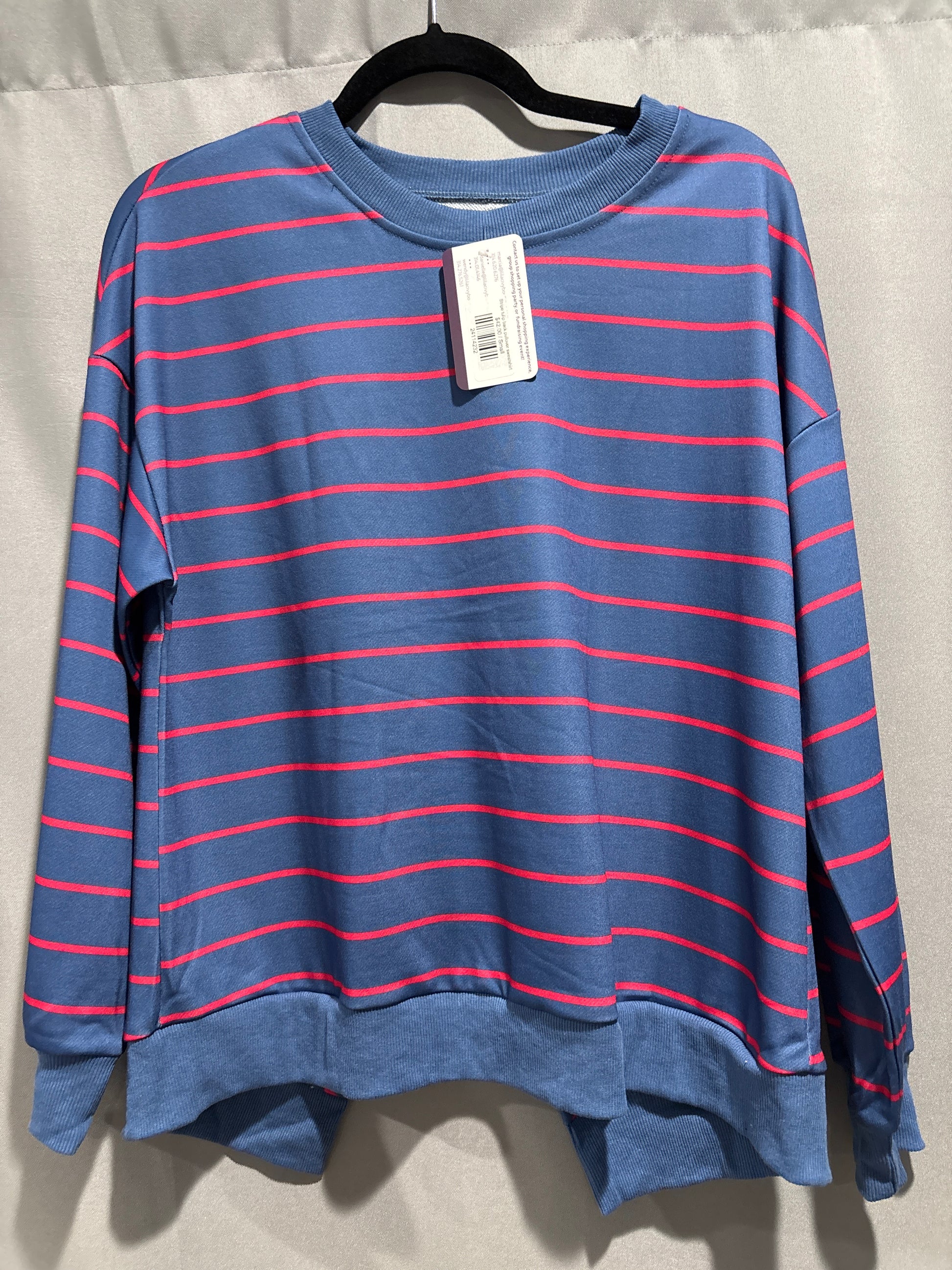 Stripe overlap drop shoulder pullover sweatshirt with tulip back.