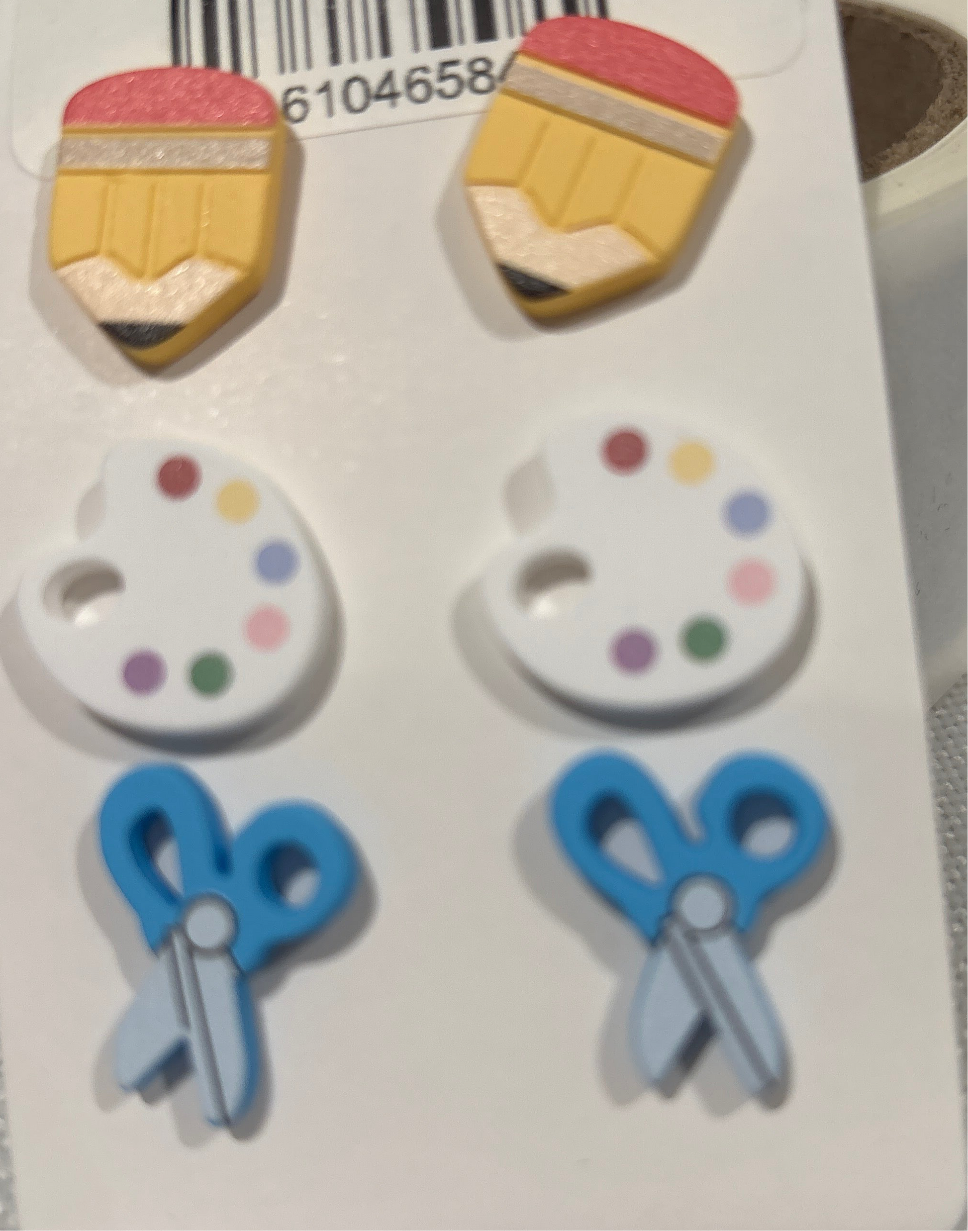 Any little girl would love this Cute collection, especially if she’s an artist. Three pair of earrings, a pencil, a color, palette and scissors. Post earrings.