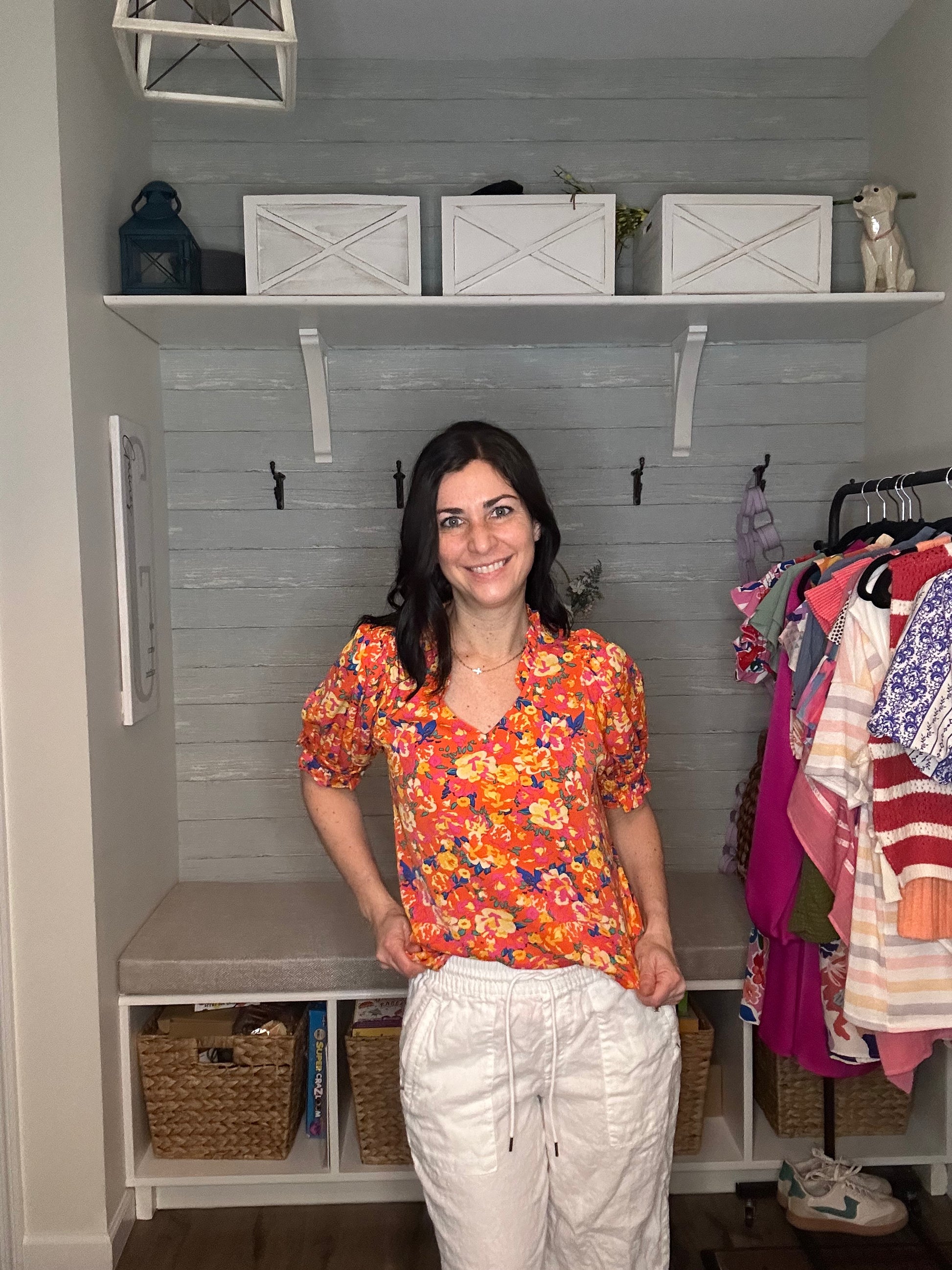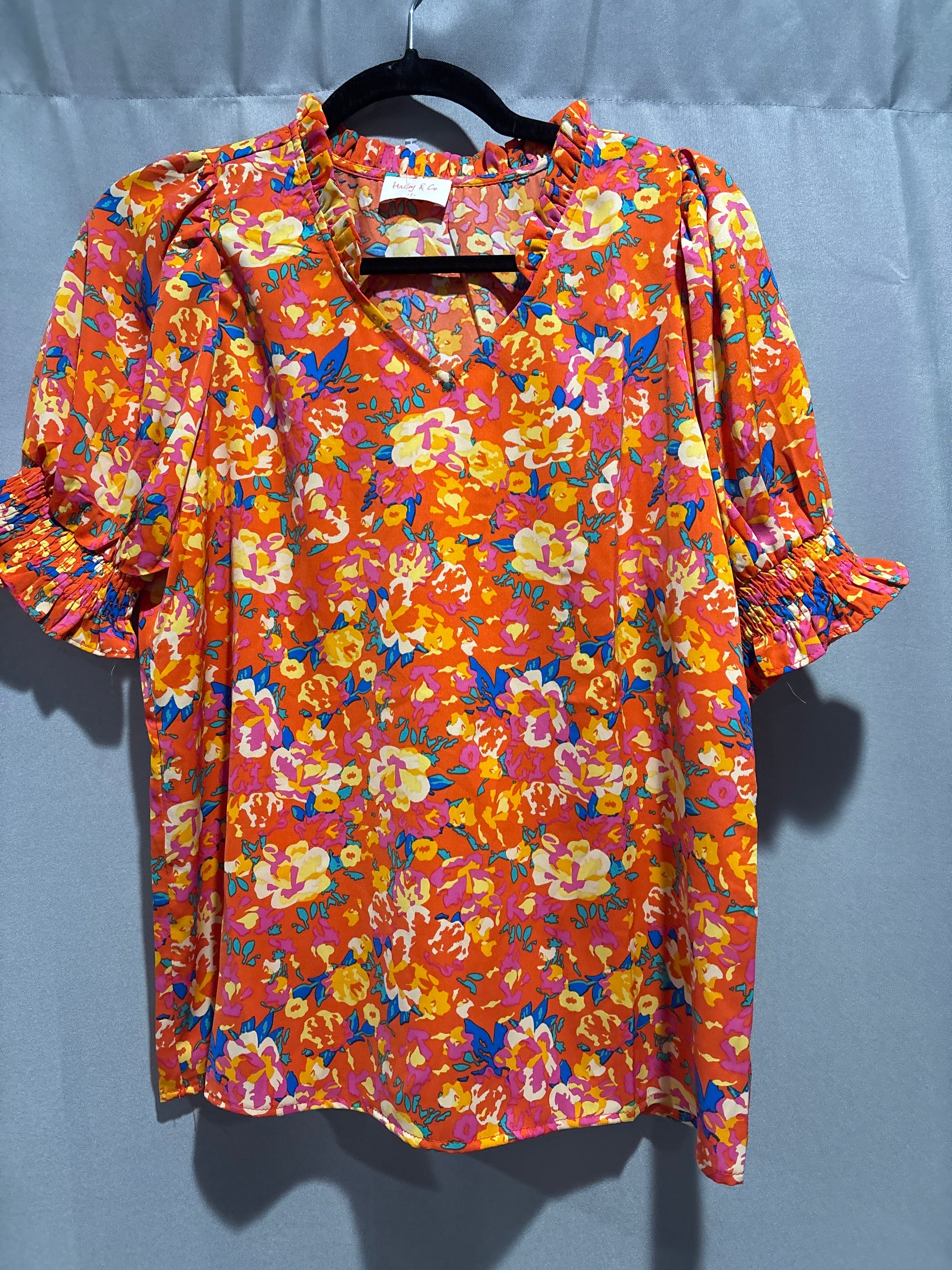 Ruffle V-neck with smocked puff short sleeves. Color orange. No stretch so may want to size up if bigger chest!